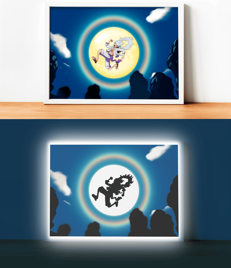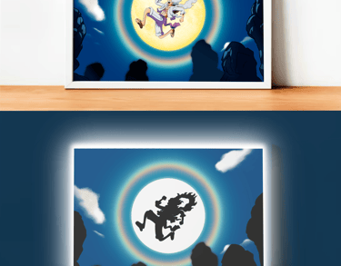 Cadre LED mettant en scène Luffy de One Piece lors de sa transformation en Gear 5 Nika.