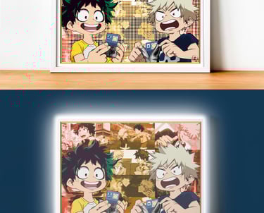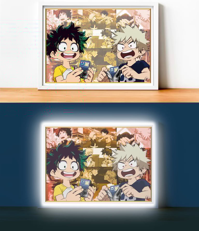 Cadre LED mettant en scène Bakugo et Izuku pendant le flash-back du dernier combat avec Shigaraki.